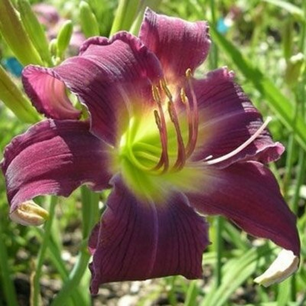 Цветок сиреневый с голубоватым глазом, желто-зеленое горло; края лепестков волнистые.