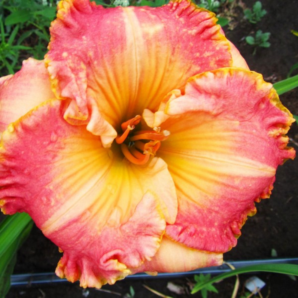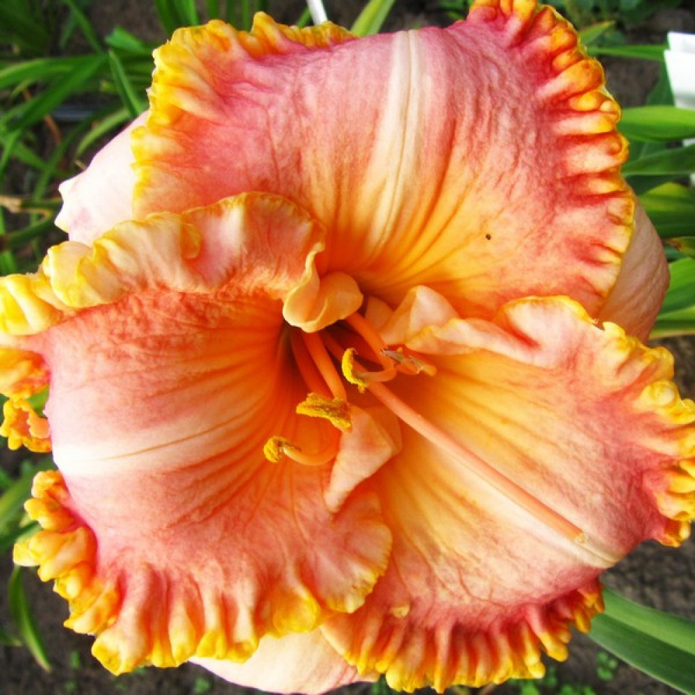 Горяче-коралово-оранжевая смесь с гофрированной желтой каймой и зеленым горлом. Сладкий аромат. Высота растения - около 75 см, диаметр цветка - до 17 см.