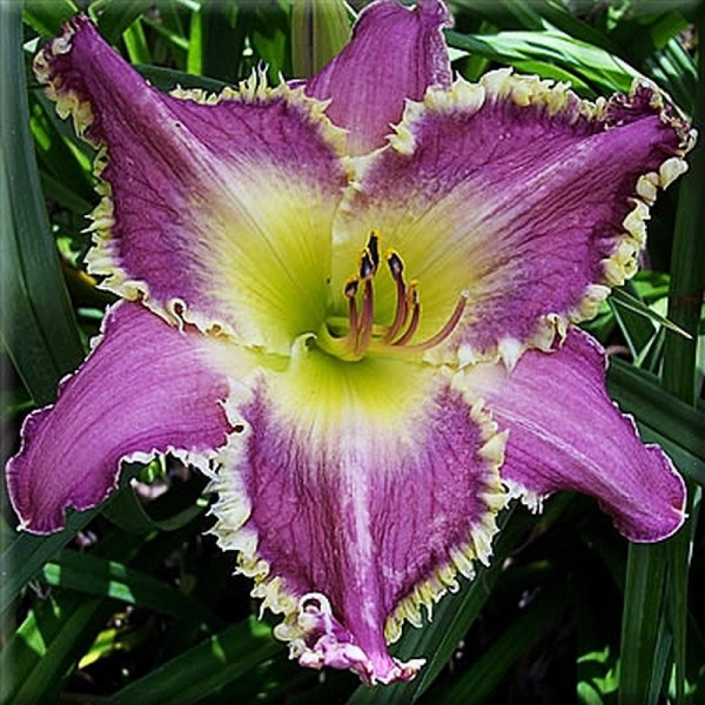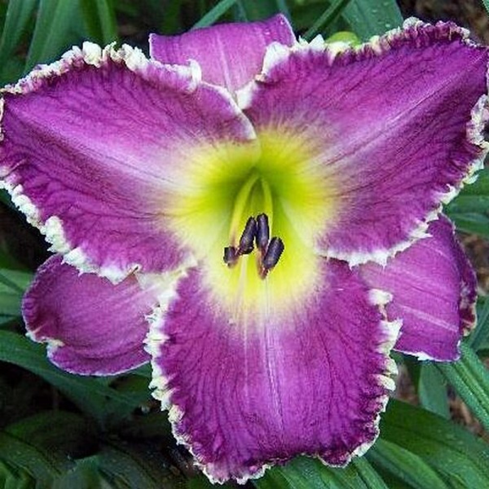 Высота - 61 см, диаметр цветка - 15 см. Темный, лавандово-фиолетовый с кремовым до сине-фиолетового ободка с желто-белой зубчатой окантовкой (акульи зубы). Супер!!!