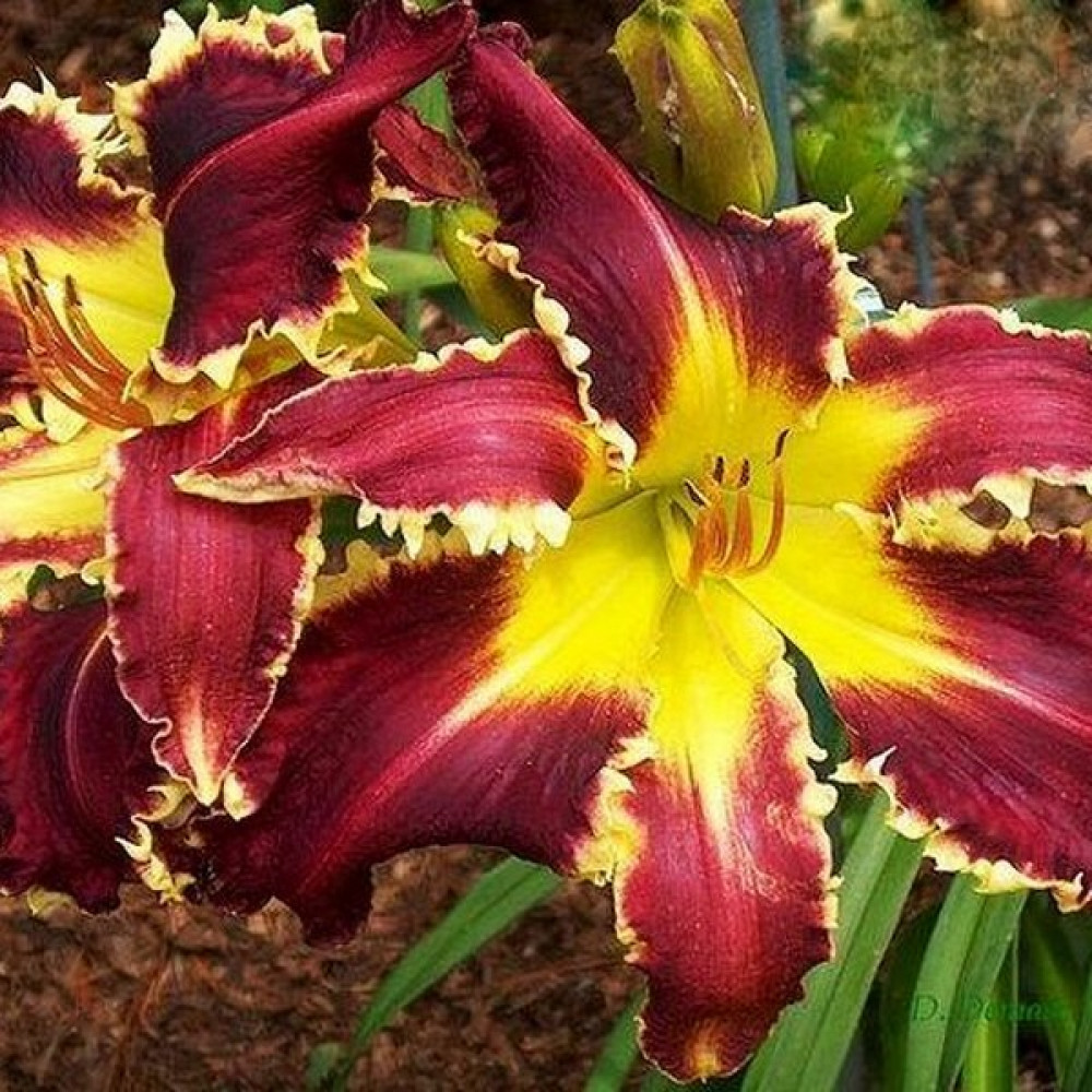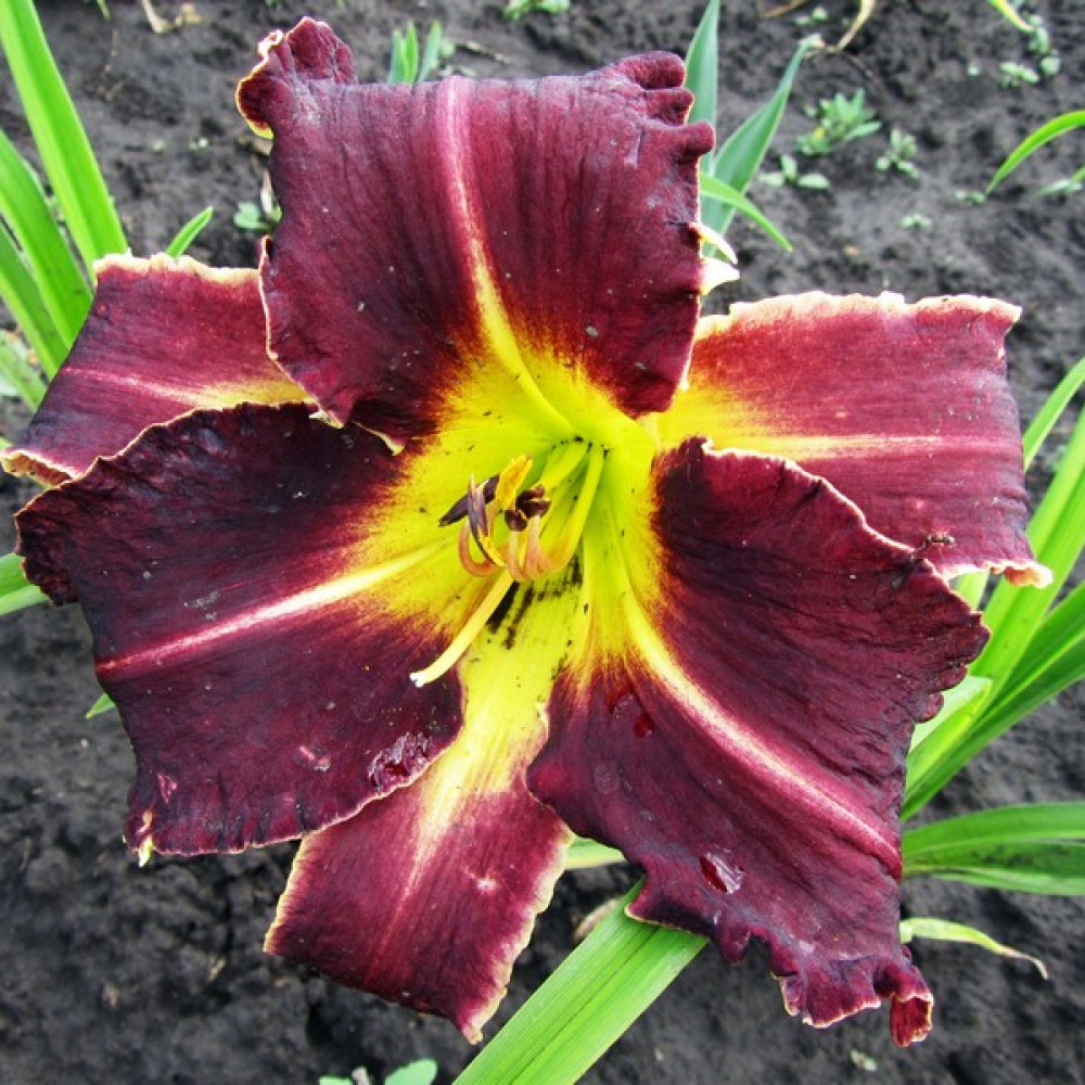 Диаметр цветка - от 19 до 25 см. Очень крупный, фиолетово-бордовый, с желтым зубчатым краем, желто-зеленым горлом. Не капризный, хорошо зимует и хорошо нарастает.