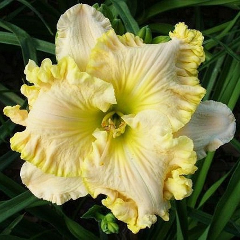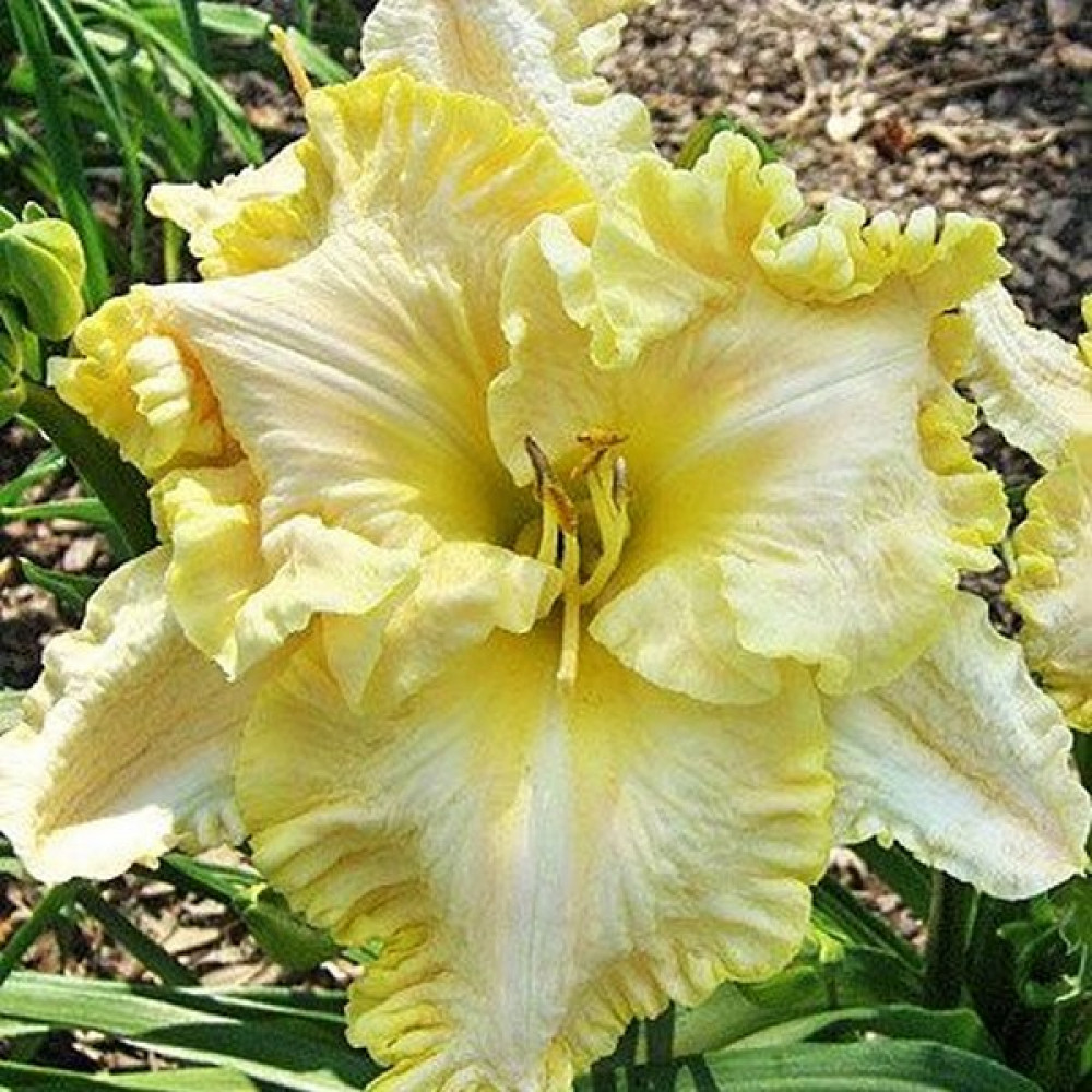 Диаметр цветка - от 17,5 см, высота - 65 см. Огромный, сливочно-желтый с розовой подложкой. Оборка 2 см. Цветет очень продолжительно. Ранне-среднего срока цветения. Красавец!!!