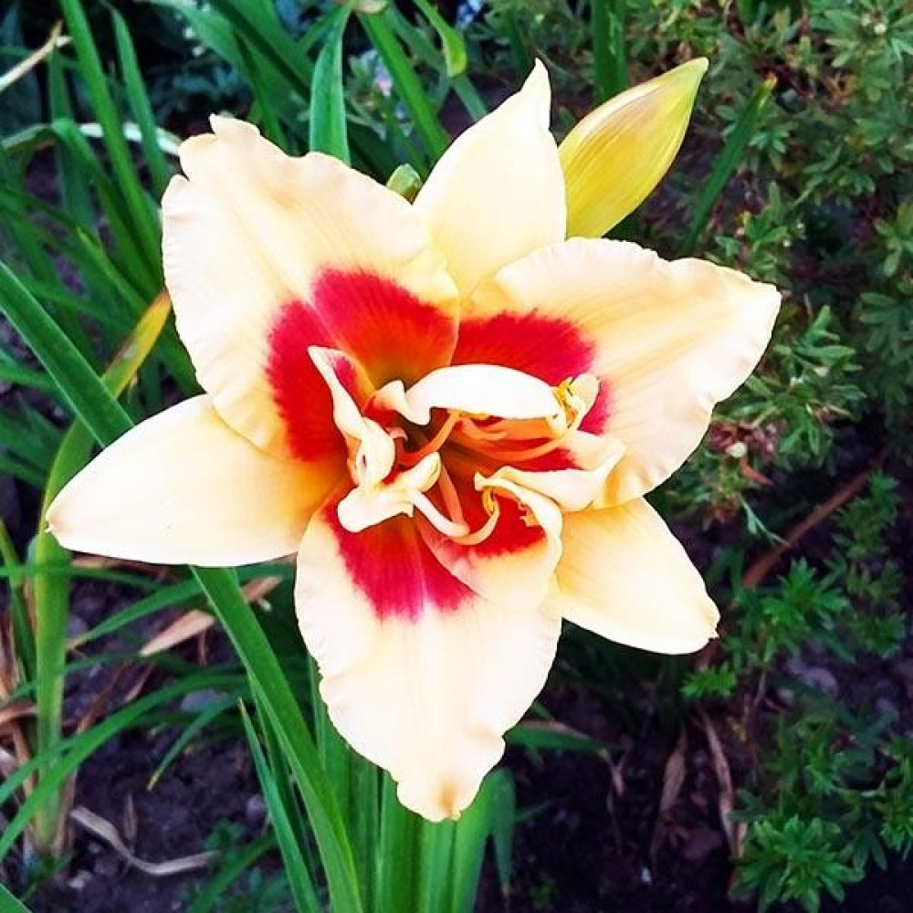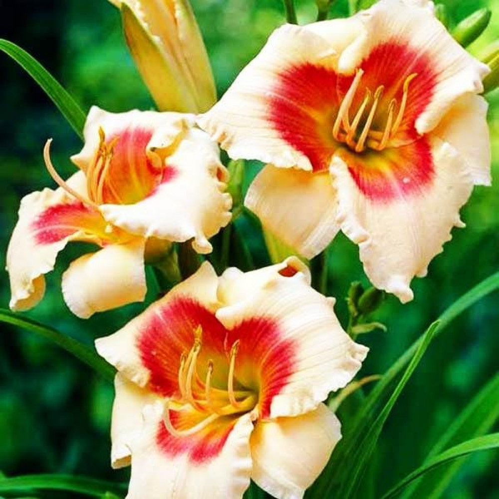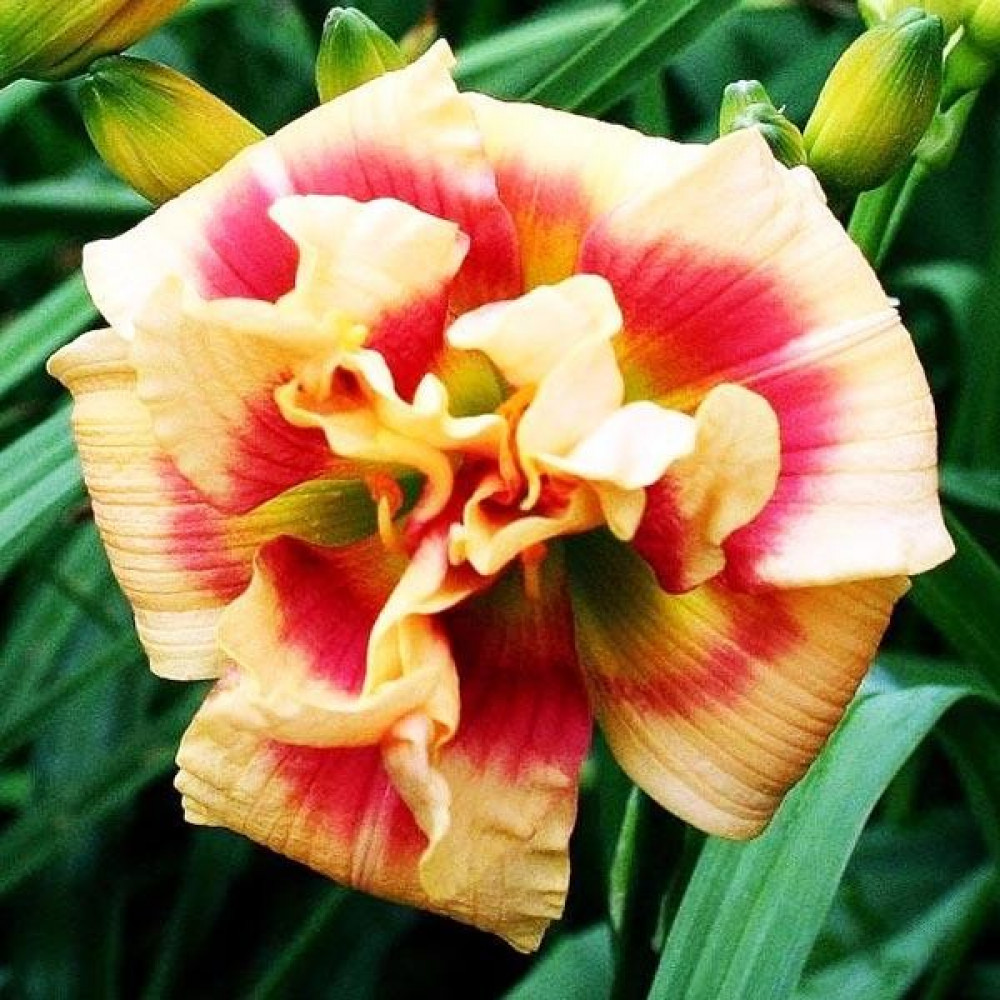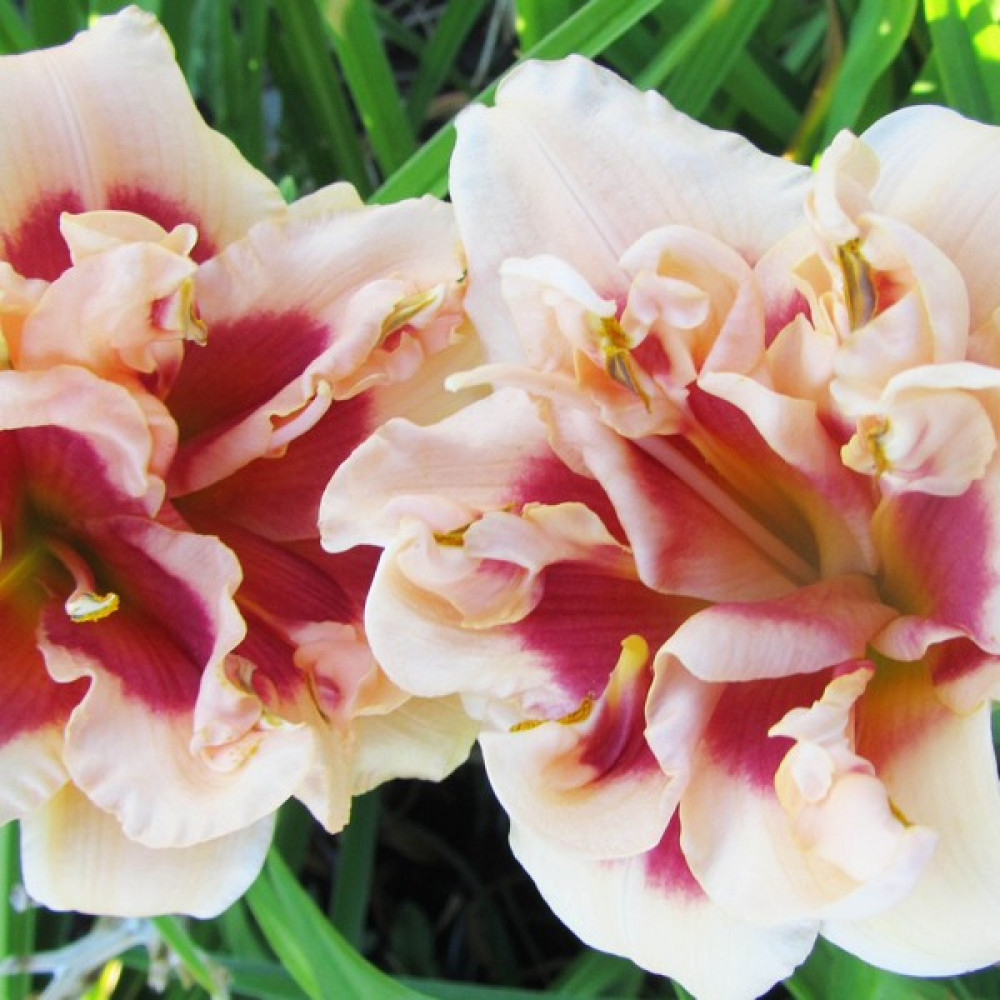 Шикарный махровый лилейник, нежно кремово-розового цвета с кирпично-красным глазом, зеленое горло. Сохраняет декоративность с весны до глубокой осени. На одном месте может расти очень долго, образуя крупные, широкие кусты.