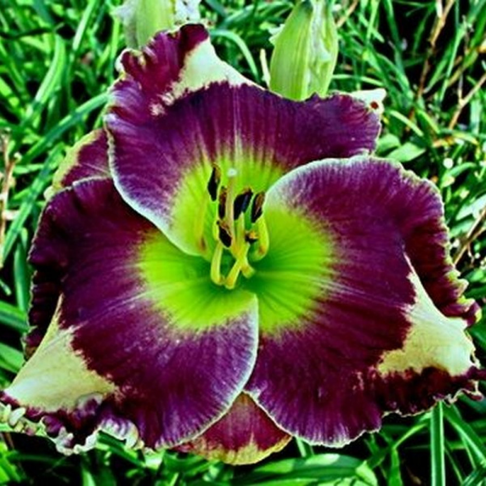 Насыщенно-фиолетовый, зеленое горло, белая кайма. Высота растения - 67 см, диаметр цветка - 16 см.