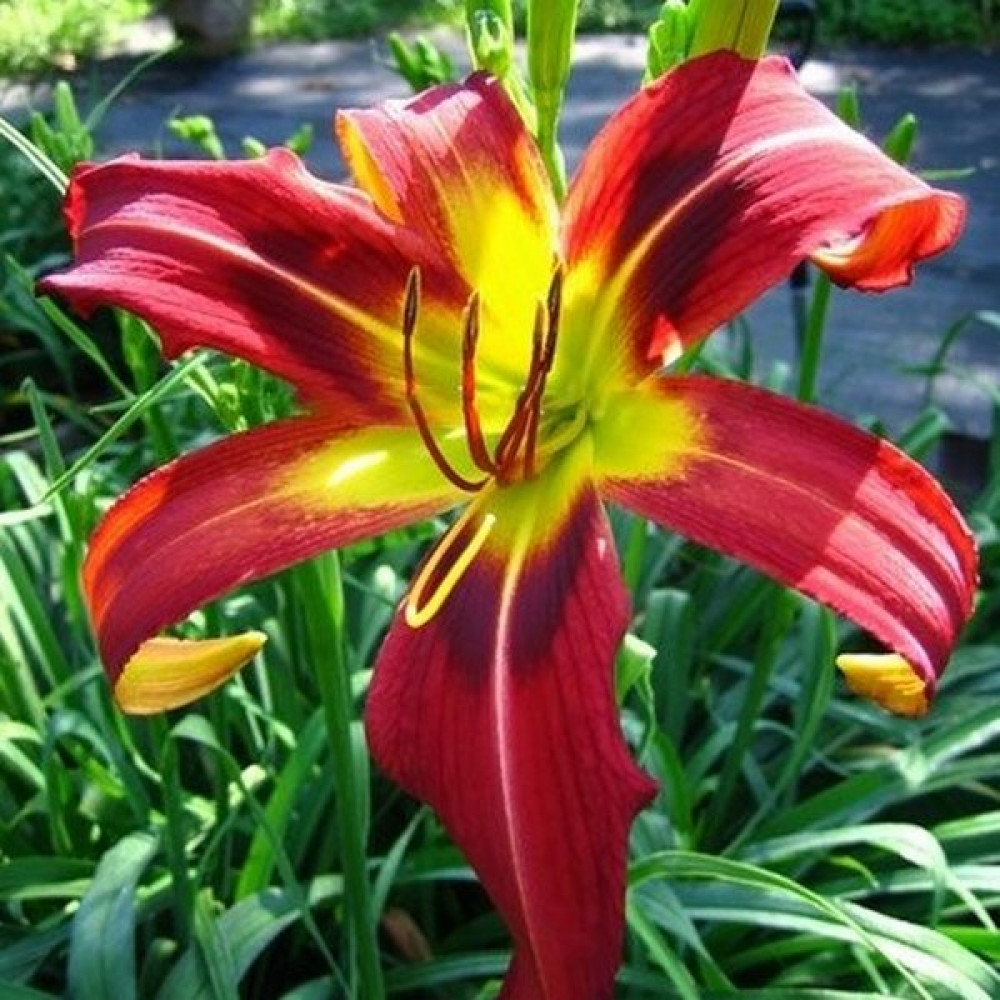 Листья линейные узкие. Цветок красно-бордового цвета с зауженными длинными лепестками и желтой горловиной (спайдер). Цветки собраны в соцветия.