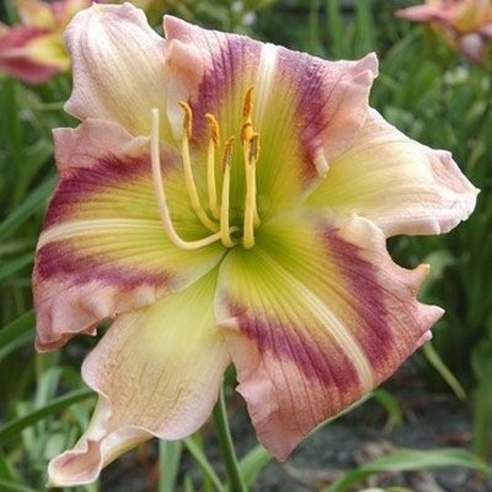 Цветки красивой формы, желто-розовые, края слегка гофрированные, горло - зеленое.