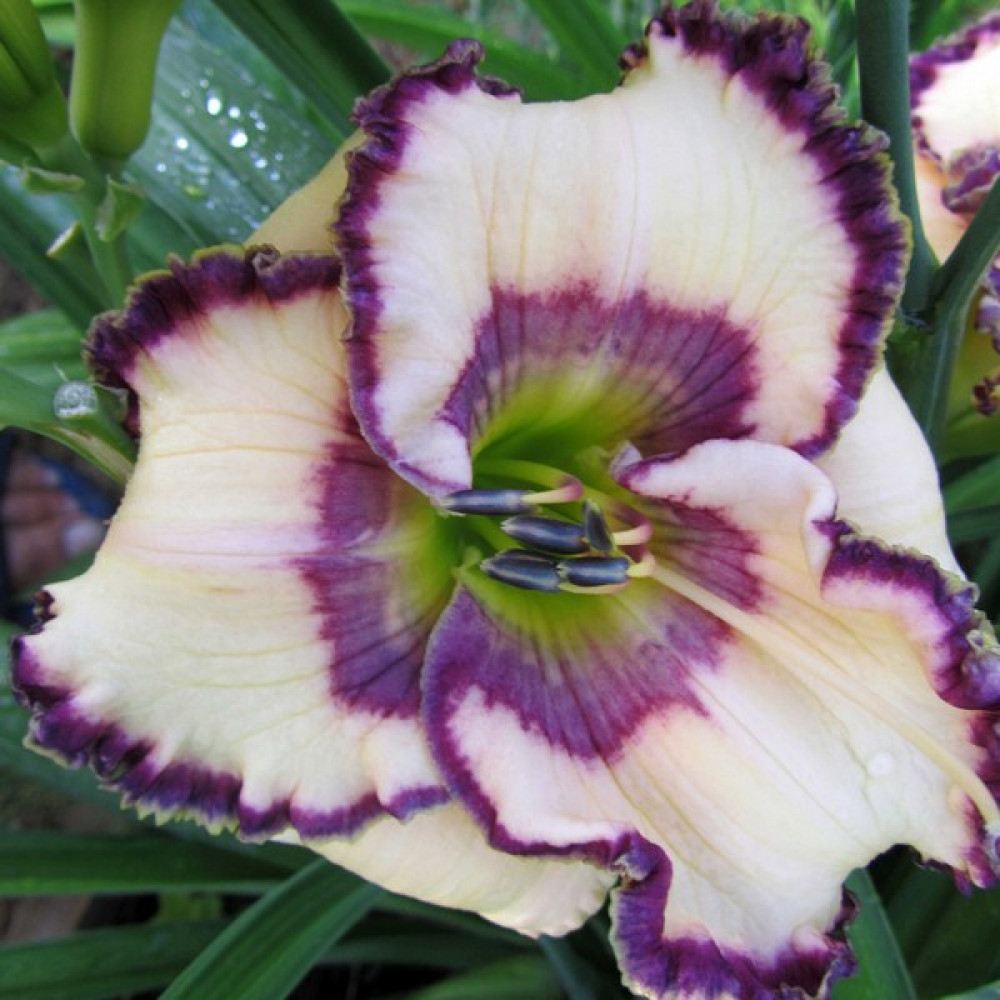 Высота растения - 73 см, диаметр цветка - 16 см. Белый с фиолетово-синим глазом, фиолетово-желтая кайма.