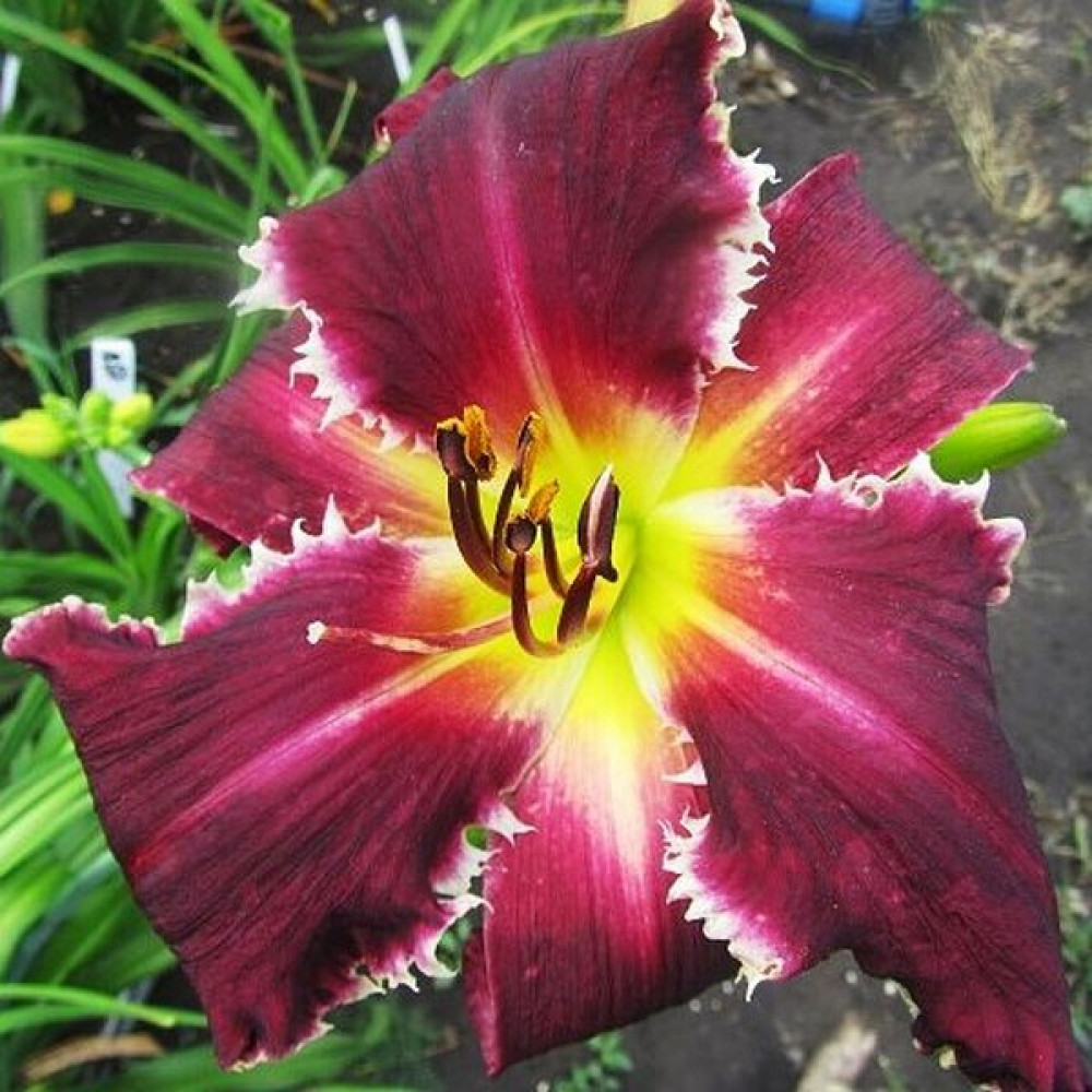 Высота - 102 см, диаметр цветка - 15 см. Красный, с большими белыми зубцами над лимонным горлом.