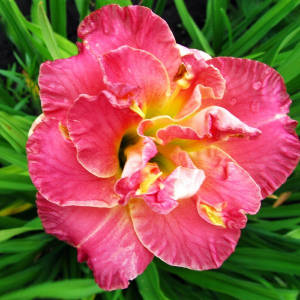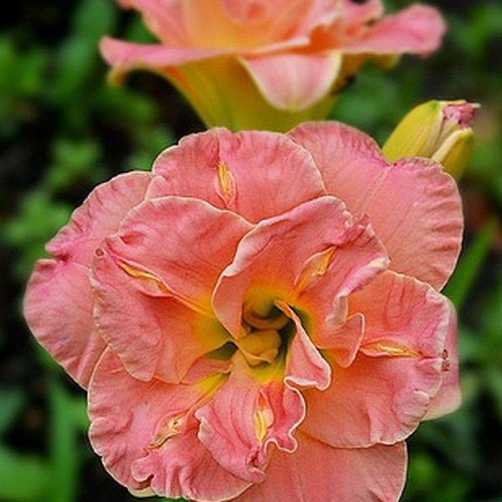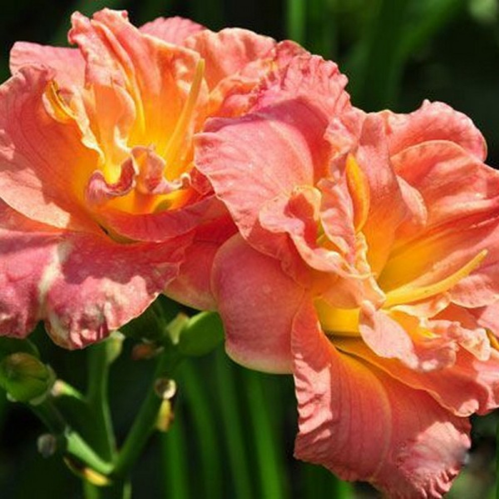 Высота - 50 см, диаметр цветка - 10 см. Среднего срока цветения. Махровый, двуцветный цветок кораллового цвета с зеленым горлом. Очень обильно цветет. Похож на цветение розы.