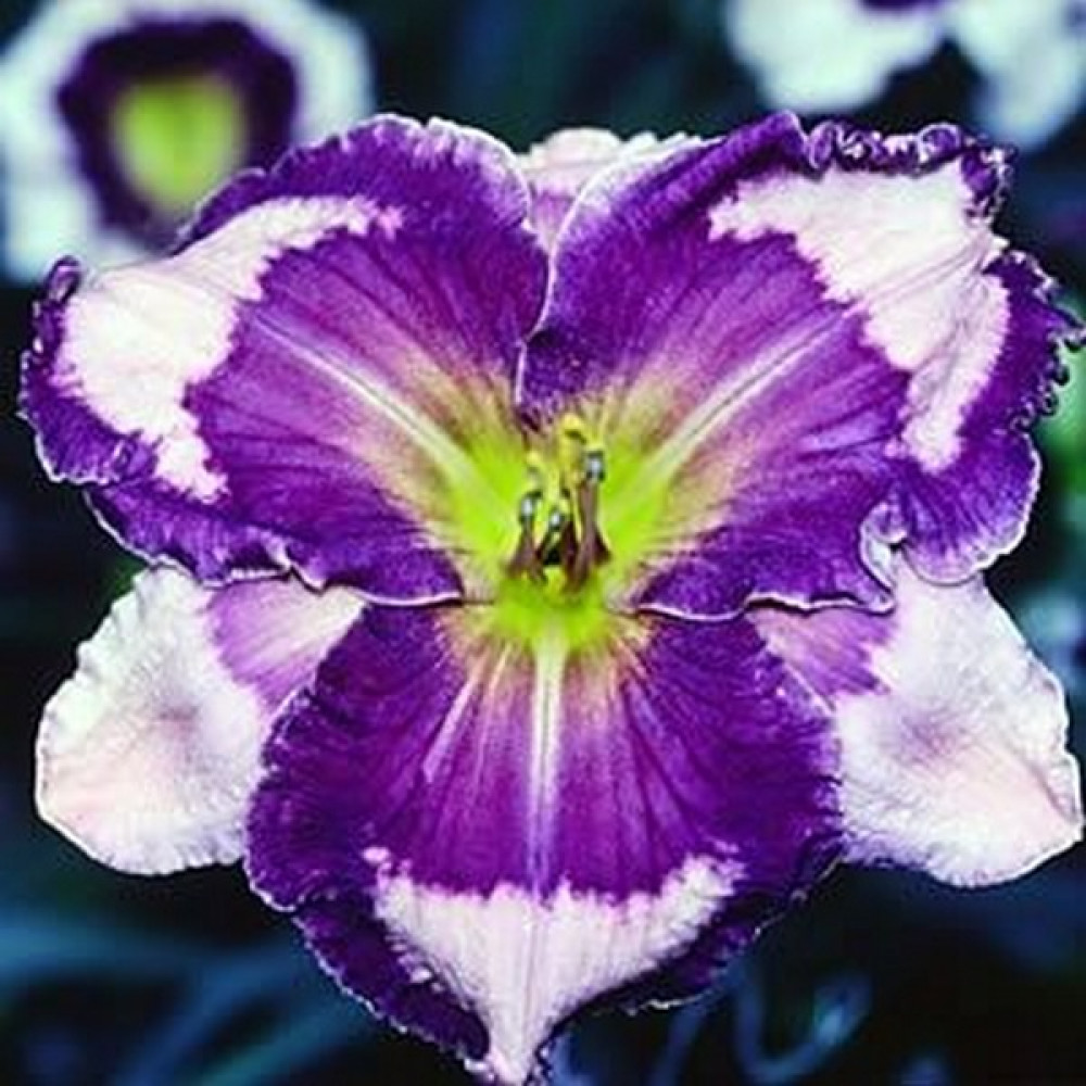 Фиолетово-белый с зеленым горлом. Высота растения - около 73 см, диаметр цветка - до 17 см.