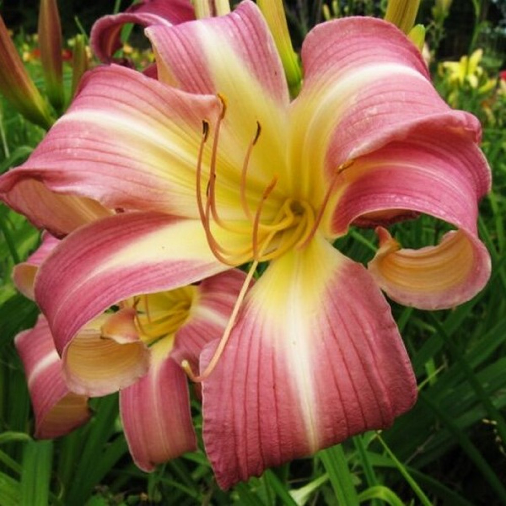 Светло лавандово-розовый с жёлтым горлом. Спайдер. Высота растения - 90 см, диаметр цветка до 20 см.
