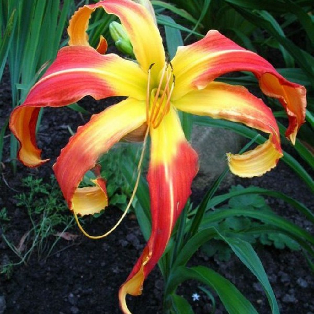 Посадка лилейника: Для посадки культуры необходима посадочная яма большего диаметра, чем корневая система растения. На дно лунки насыпается холмик из плодородной почвы, вносится столовая ложка гранулированного комплексного цветочного удобрения или перепревший навоз, разбавленный древесной золой. На вершине холмика размещают растение, аккуратно расправляя его корневую систему и засыпая ее грунтом так, чтобы корневая шейка не была заглублена ниже 2 см. Посадочную яму необходимо тщательно заполнить грунтом, последовательно уплотняя пространство таким образом, чтобы в земле не оставалось пустот. Засыпанную землей лунку обильно увлажняют.