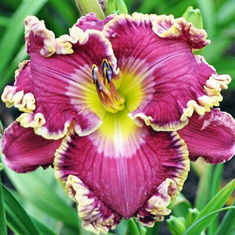 Высота растения - 74 см, диаметр цветка - 15 см. Виноградно-пурпурный с дымчато-серым глазом и желтой каймой по сильно гофрированным краям с завитушками "крылья ангела". Очень хорошо растет в средней полосе.