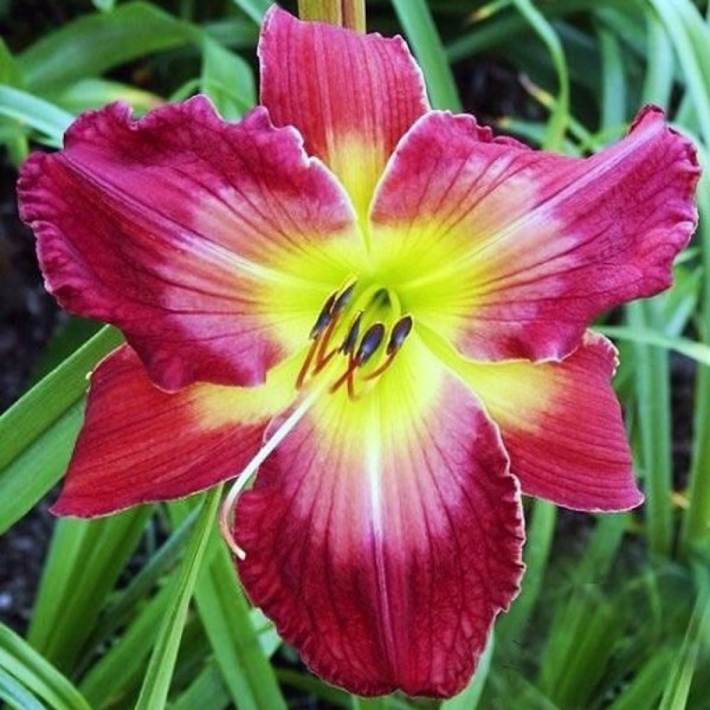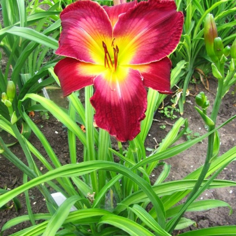Насыщенный красный с огромным лиловым глазом. Горло желто-зеленое. Высота цветоносов 70 см, диаметр цветков 20 см.
