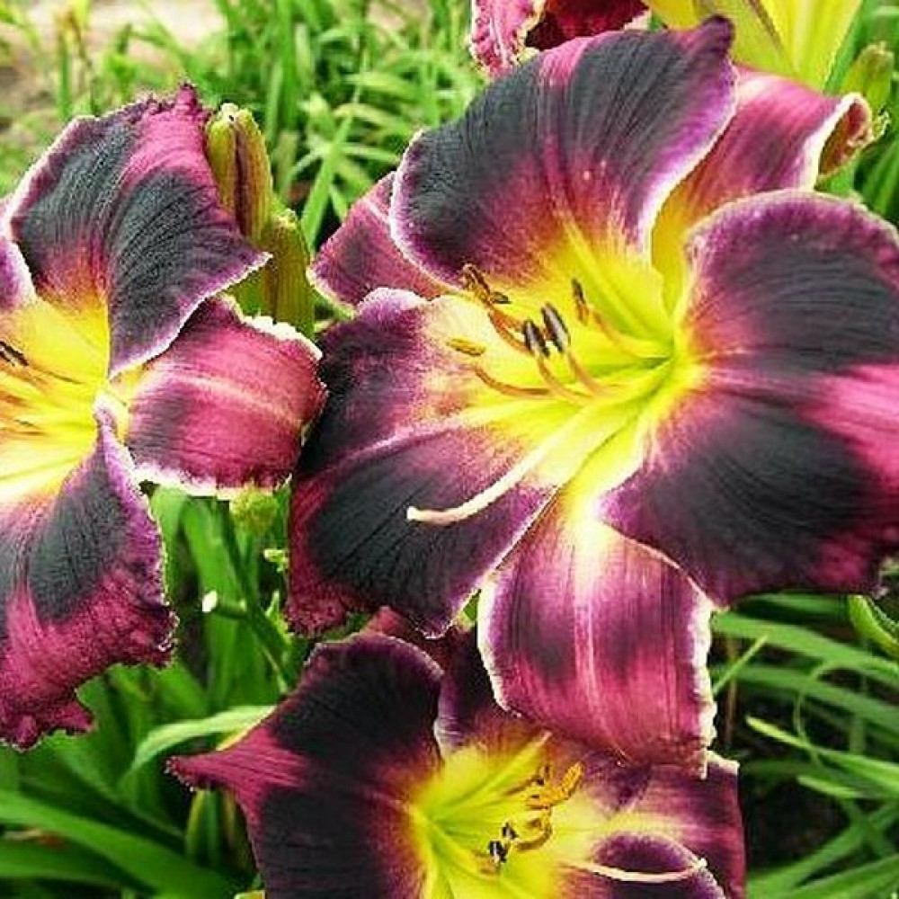Высота растения - 66 см, диаметр цветка - 14 см. Темно-фиолетовый, с более темным глазом над зеленым горлом и белой карандашной окантовкой. Очень ароматный, хорошо растущий и цветущий.