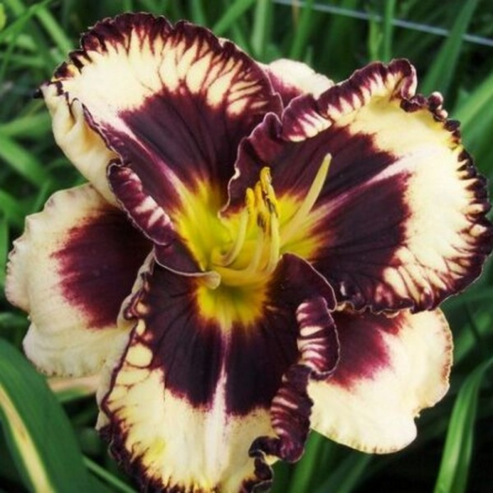 Кремовый с темно-бордовым глазом и такого же цвета гофрированной каймой. Высота - 55 см; диаметр цветка - 15 см.