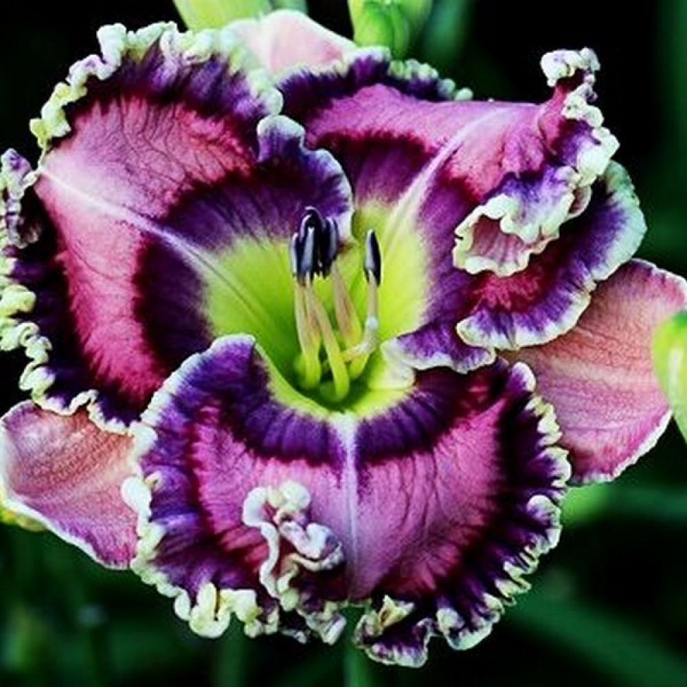 Лилейник очень сложной окраски - кремово-малиновый с темным голубовато-малиновым глазом над зеленым горлом и тройной гофрированной каймой - малиновой, синей и белой. На каждом цветоносе 35 бутонов. Очень красив! Высота растения - около 90 см, диаметр цветка - до 15 см.