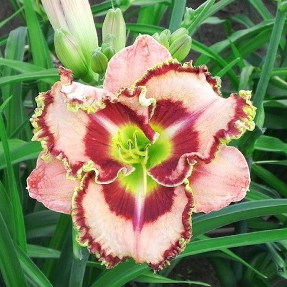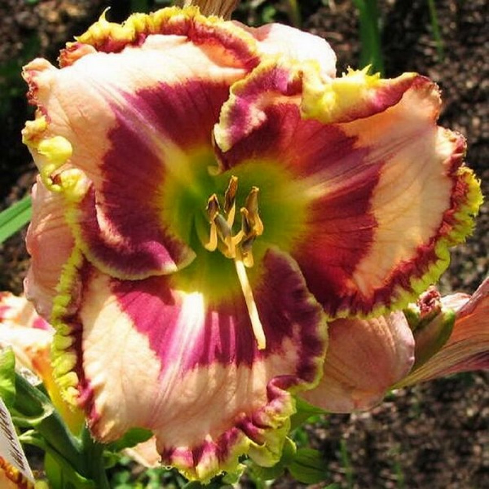 Высота растения - 81 см, диаметр цветка - 15 см. Зеленое горло, лавандовый фигурный глаз на кремовых лепестках с салатовой зубчатой каймой.