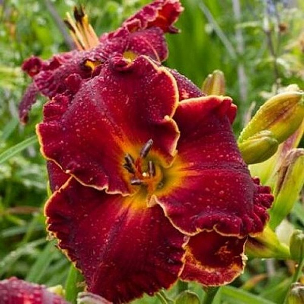 Цветки тёмно-красного цвета с гофрированным жёлтым краем и желтым горлышком, собраны в соцветия. В конце лета - начале осени, возможно, повторное цветение.