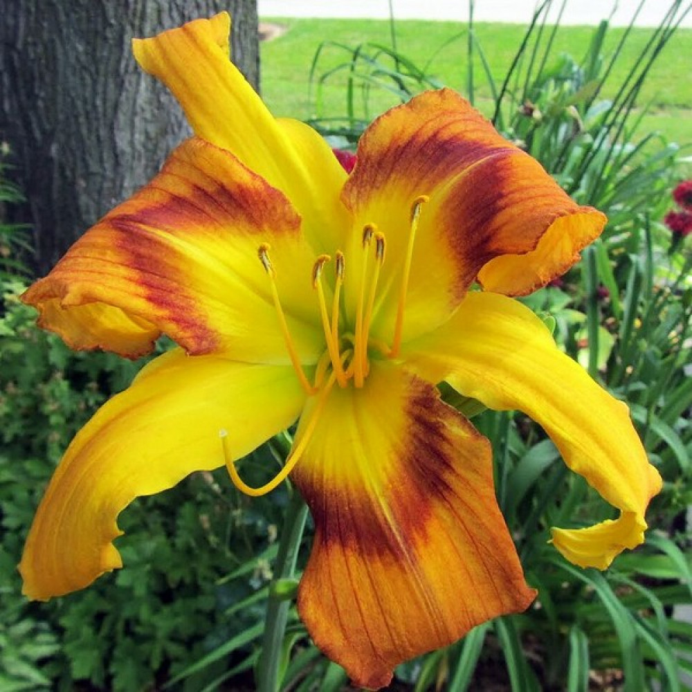Посадка лилейника: Для посадки культуры необходима посадочная яма большего диаметра, чем корневая система растения. На дно лунки насыпается холмик из плодородной почвы, вносится столовая ложка гранулированного комплексного цветочного удобрения или перепревший навоз, разбавленный древесной золой. На вершине холмика размещают растение, аккуратно расправляя его корневую систему и засыпая ее грунтом так, чтобы корневая шейка не была заглублена ниже 2 см. Посадочную яму необходимо тщательно заполнить грунтом, последовательно уплотняя пространство таким образом, чтобы в земле не оставалось пустот. Засыпанную землей лунку обильно увлажняют.