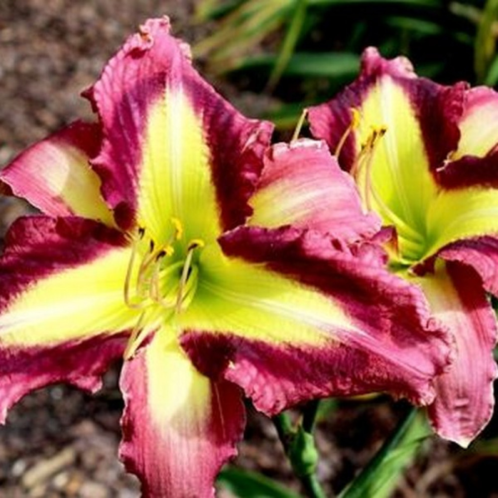 Гигантский цветок лилейника с зеленым горлом и темно пурпурным призматическим глазом переходящим в пурпурно-розовые лепестки. Это самый высокий сорт лилейника с призматическим глазом!