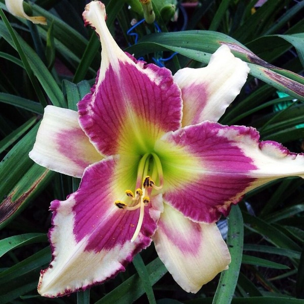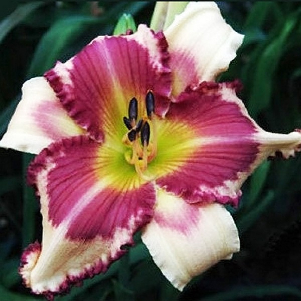Высота растения - 67 см, диаметр цветка - 19 см. Огромный цветок кремово-белого цвета с ярким малиновым глазом и окантовкой. Горло зеленое. Ароматный.