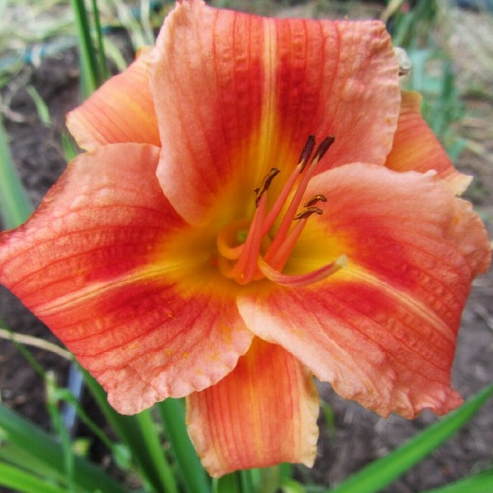 Ярко-красные цветы с легкой гофрировкой края. Светлая средняя линия, желто-зеленое горло. Полувечнозеленый, диплоид.