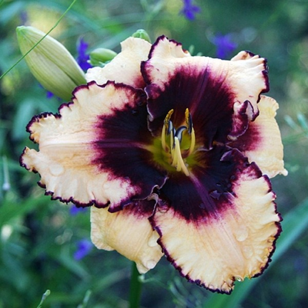 Высота - 60 см, диаметр цветка - 15 см. На кремово-кофейных лепестках этого цветка огромное черно-бордовое пятно и такого же цвета темная гофрированная кайма. Очень выразительный и красивый.