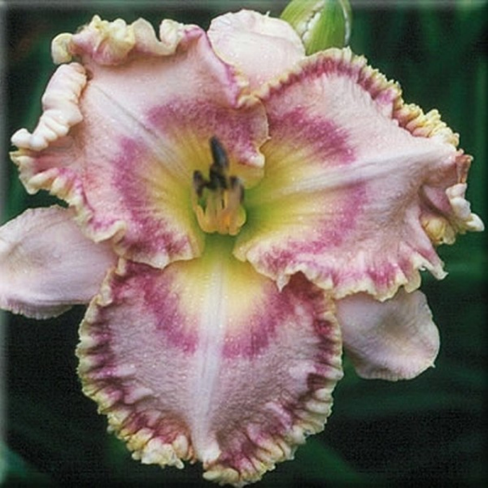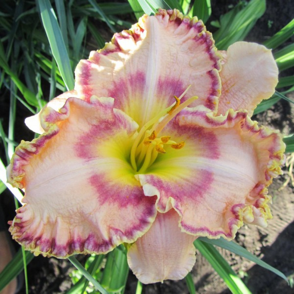 Цветок плотно гофрированный, кремово-розоватый. Внутренняя часть каймы и обруч двухтоновые, красновато-фиолетовые, внешняя часть каймы золотистая. Выпуклая светлая средняя линия. Ярко-лимонное, в глубине зеленое горло. Полувечнозеленый, тетраплоид.