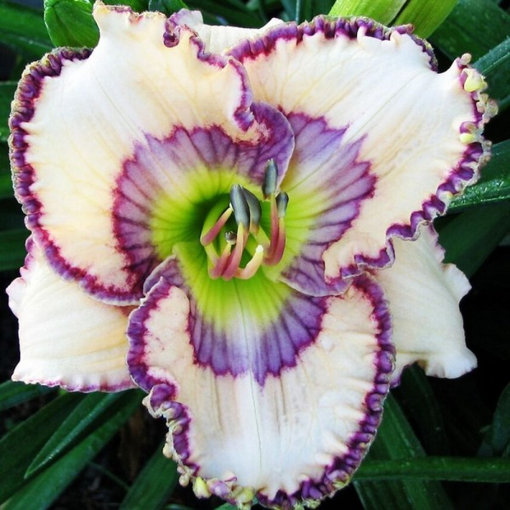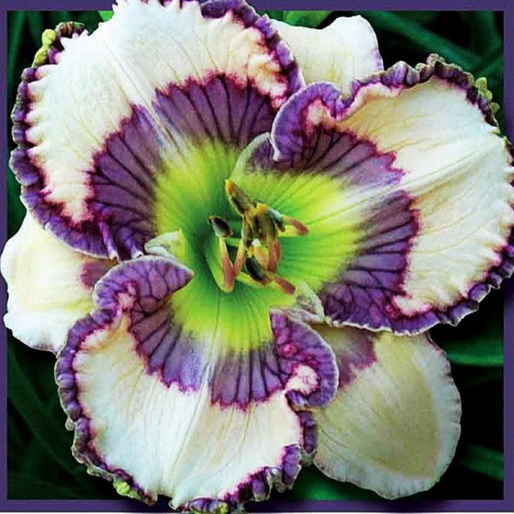 Высота растения - 70 см, диаметр цветка - 14 см. Белый, фиолетовый глазок над зеленым горлом и фиолетово-желтая кайма.