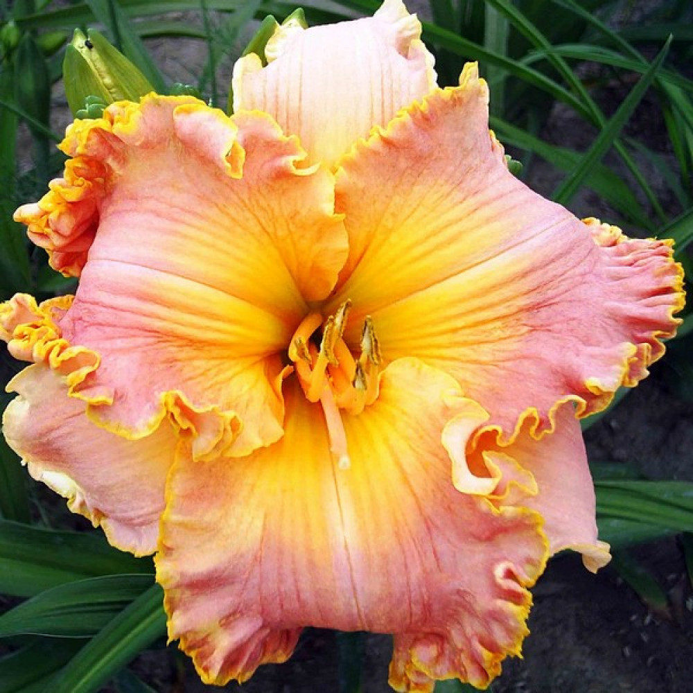 Высота растения - 65 см, диаметр цветка - 14 см. Насыщенно кораллово-лососевый с переходом в насыщенно золотой в центре, вспененная позолоченная супер гофрировка. Отлично цветет и хорошо растет!