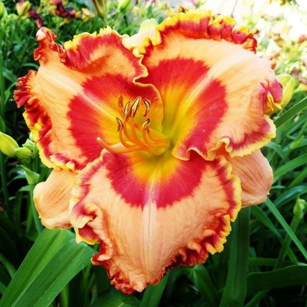 Высота – 80 см, диаметр цветка - 16,5 см. Оранжево-розовый цветок с двойной каймой, желто-зеленое горло, красный глаз. Среднеранний. Цветение повторное. Шедевр!!!