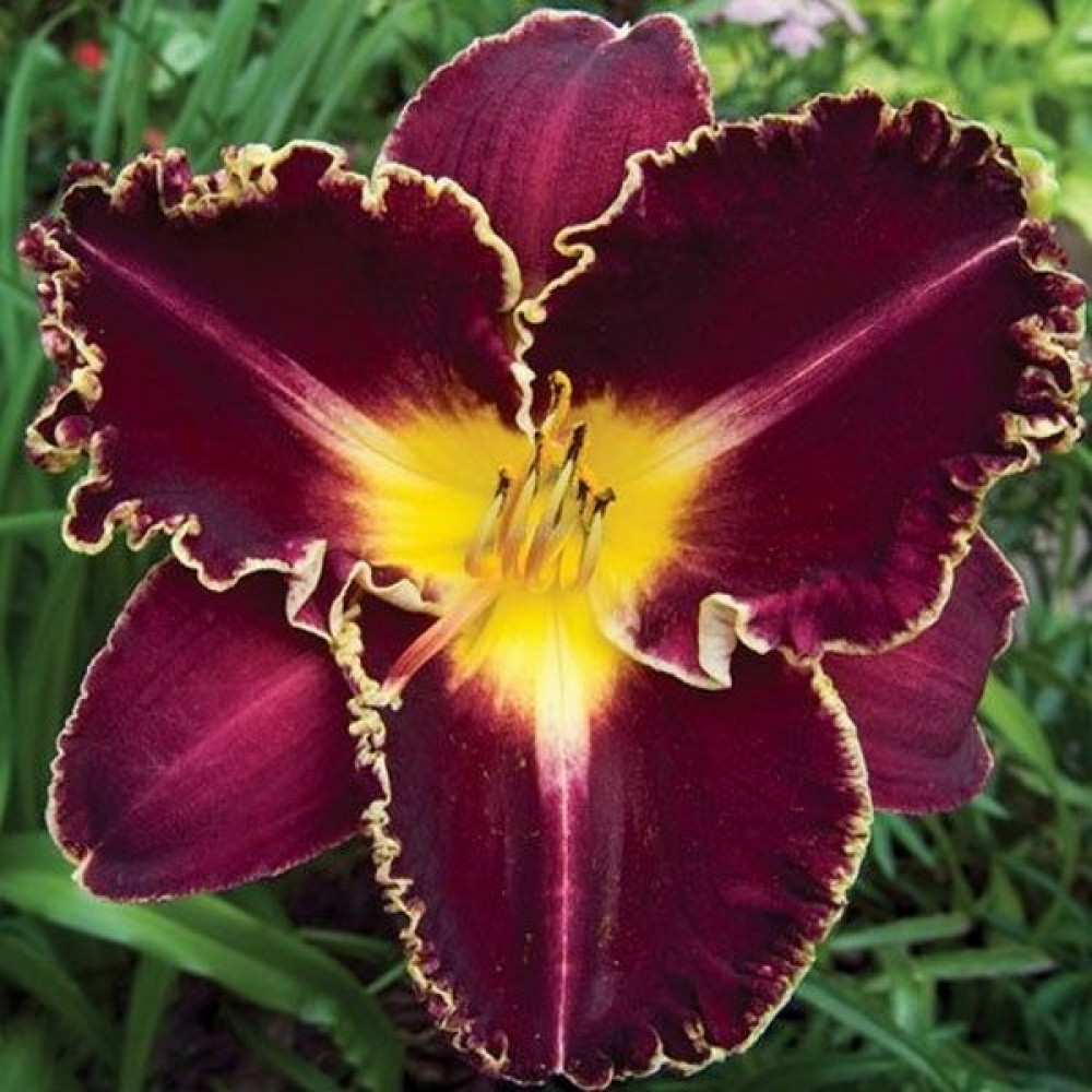 Листья линейные узкие. Тёмно-бордовые цветки с желтым горлышком, собраны в соцветия. Очень красивый! Изумительно будет смотреться среди камней в альпийской горке, на берегу пруда, при групповых и одиночных посадках на газонах и цветниках.