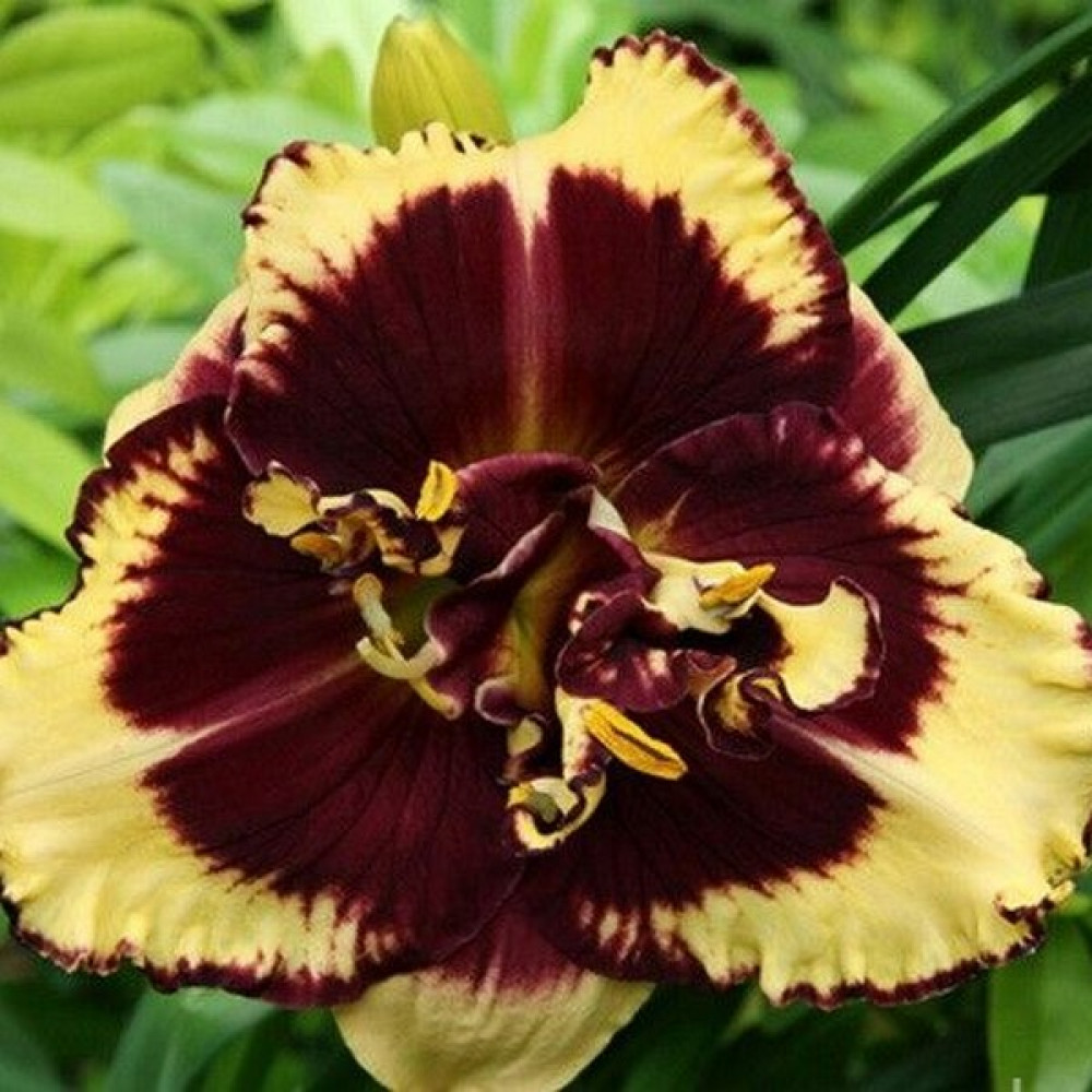 Сорт 2015г., светло-желтый с обширным пятном глубокого бордового цвета и тонким бордовым кантом. Высота растения - 65 см, диаметр цветка - около 15 см.