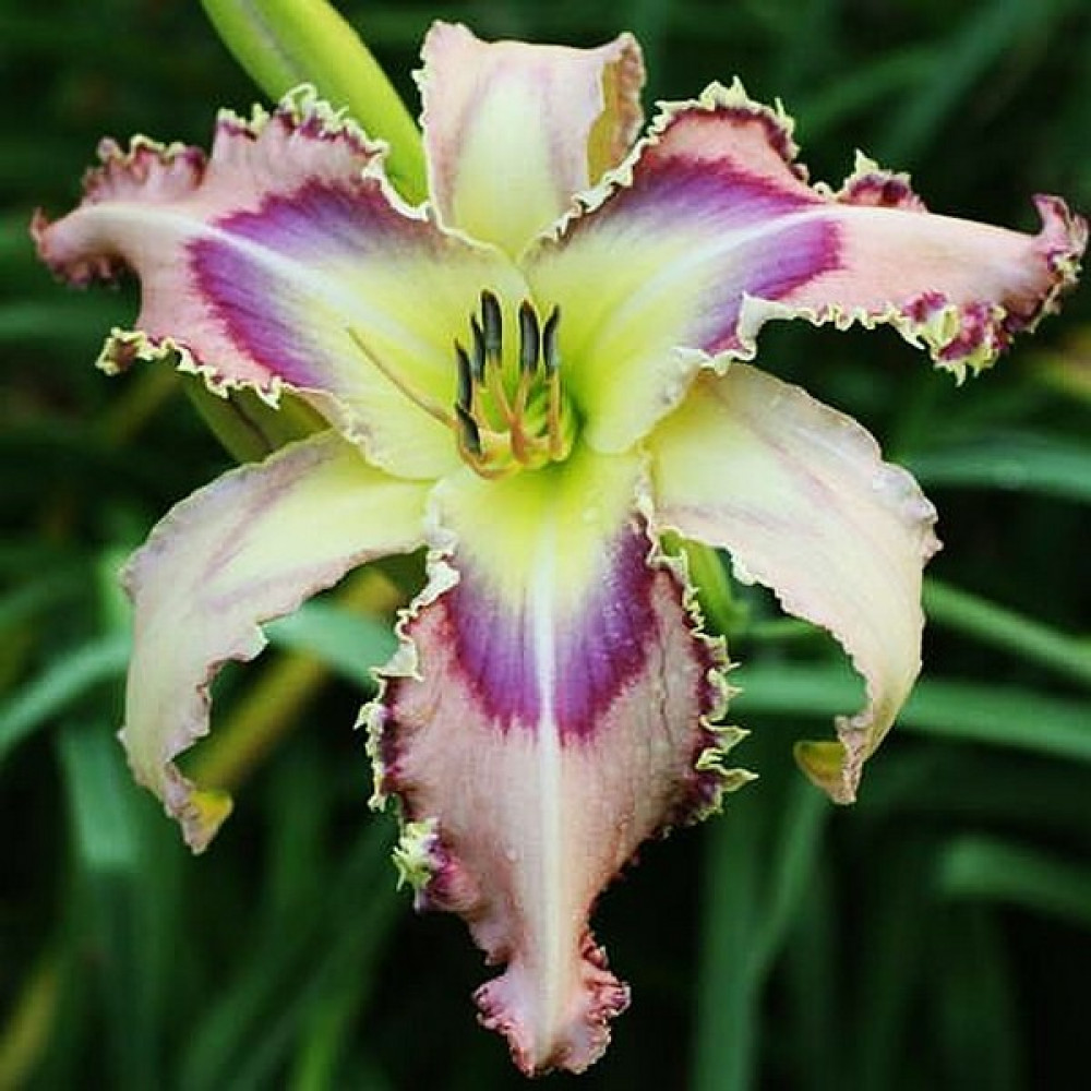 Шикарный, кремово-лавандовый цветок c сине-фиолетовым глазом вокруг зеленого горла и каймой того же цвета. По краю лепестков - кремовые и белые зубцы.