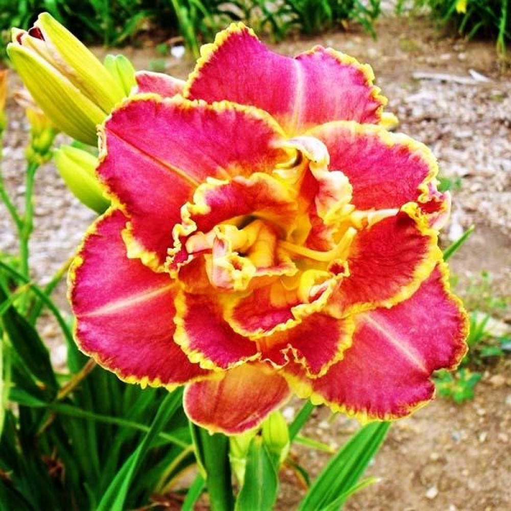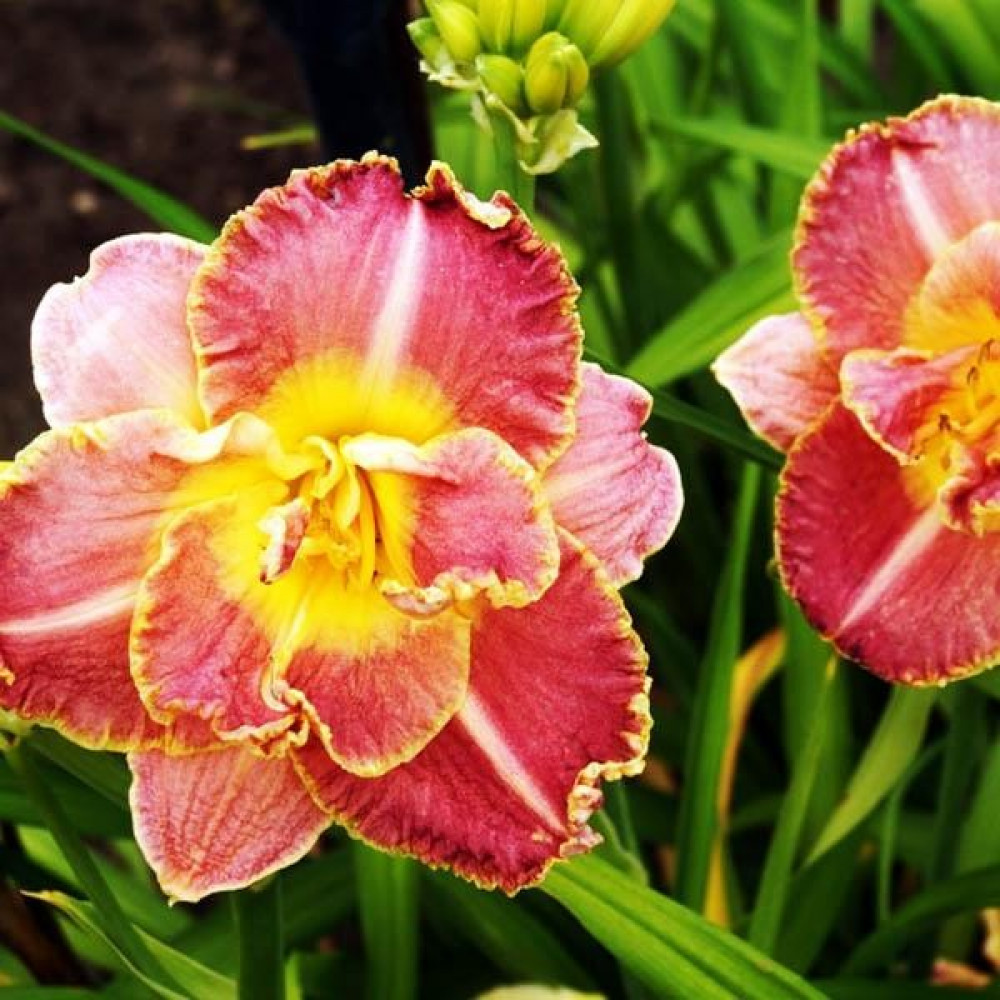 Махровый лавандо-розовой цветок с зеленым горлом. Широкие лепестки окружены золотистой гофрированной каймой. Имеет подчеркнутый светлый водяной знак. Цвет переменчивый: в жару светло розовый, в прохладную погоду, насыщенный лавандово-розовый. Обильное эффектное цветение в середине лета.