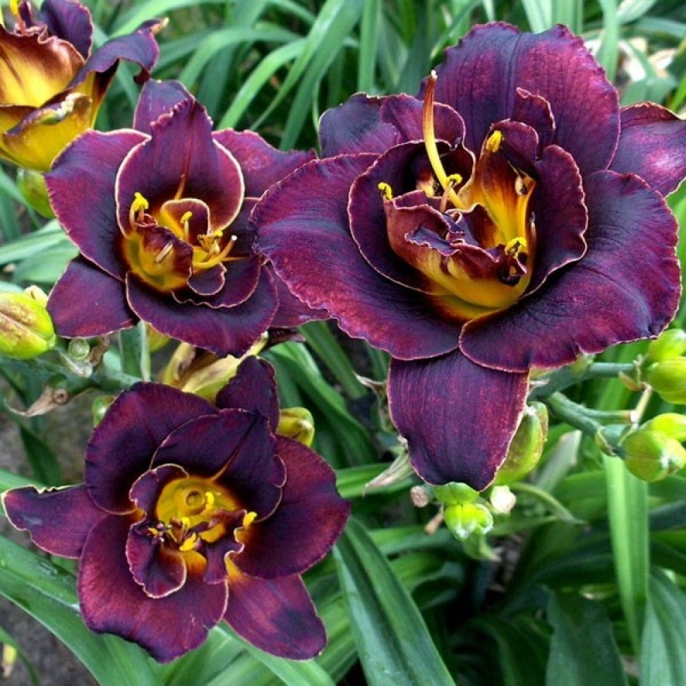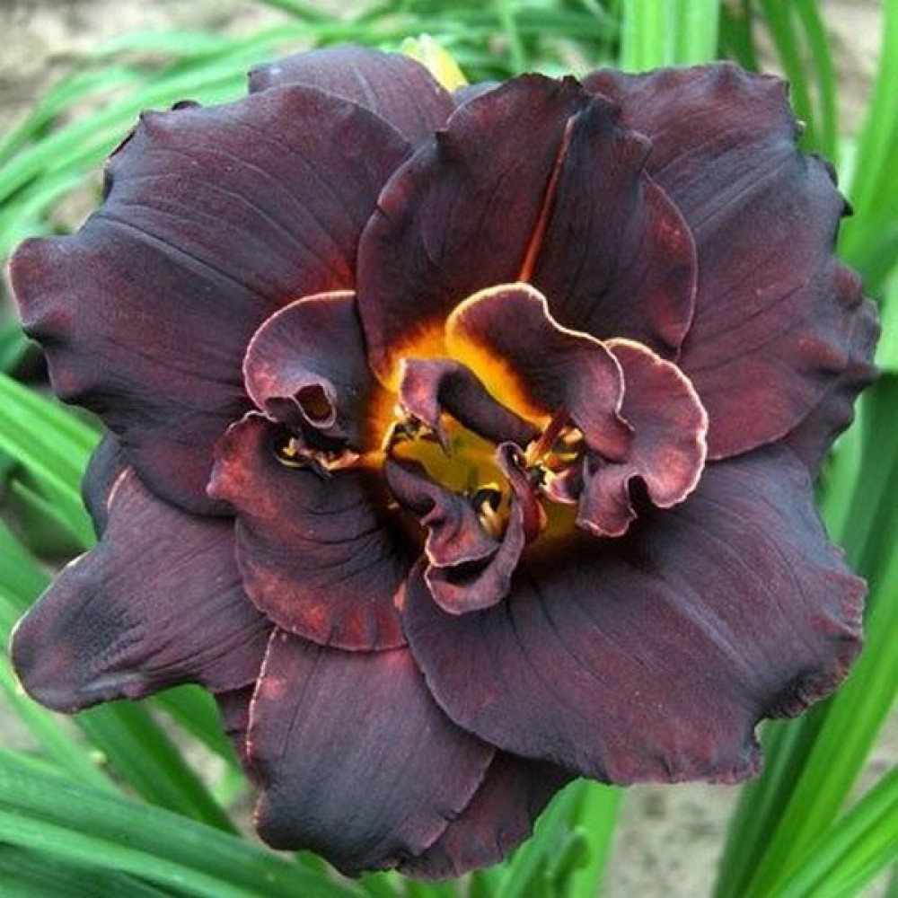 Многолетнее, травянистое растение. Цветок махровый, тёмно-фиолетовый с жёлтым центром. Обладает приятным ароматом. Листья узкие, мечевидные. Цветение обильное, повторное.