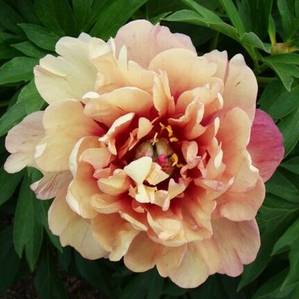 Редкий и необычный гибрид между садовыми пионами и древовидными. Высоко ценятся коллекционерами, пионы очень выносливы. Куст высокий, прочный с пышными зелеными листьями, которые стоят до и в осенний период. Огромные цветы двойные полумахровые, с легкими розовыми лепестками, темно-розовых вспышек и контрастными желтыми тычинками. Мягкий аромат.