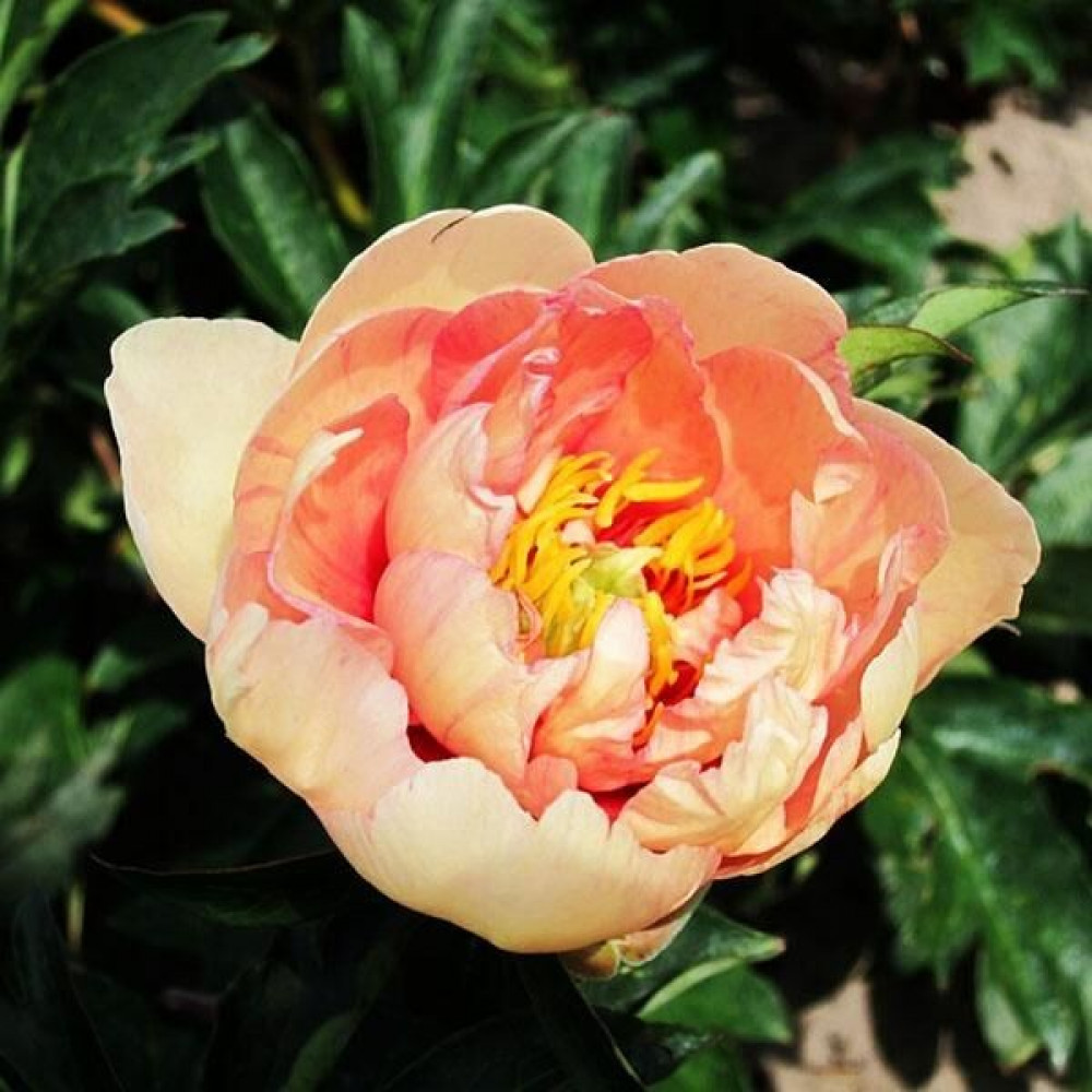 Получен в результате скрещивания травянистого и древовидного пионов. Цветы полумахровые и махровые. Внешние лепестки кремово-розовые. Бутон светло бежевый, при распускании - с нежными оттенками бежевого и розового цвета. Центр украшают желтые тычинки. Куст имеет прочные стебли и зеленую листву. Пион среднего срока цветения. Великолепно будет смотреться при групповых и одиночных посадках на газонах и цветниках. Используется для создания букетов.