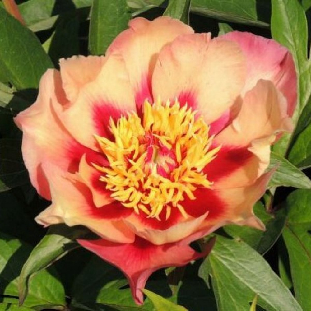 Очень красивый сорт! Полумахровые, ароматные цветки. Бледный жёлто-абрикосовый цвет, постепенно переходит в тёмно-розовый оттенок. Тычинки желтые. Куст округлой формы. Среднего срока цветения. Великолепно будет смотреться при групповых и одиночных посадках на газонах и цветниках. Используется для создания букетов.