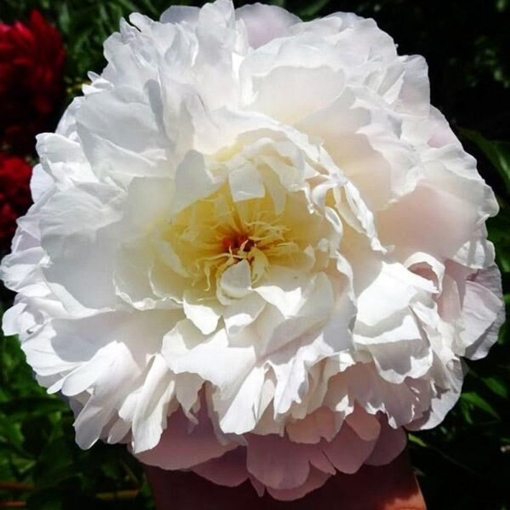 Роскошный белоснежный цветок, привлечет к себе внимание всех гостей и соседей. Великолепный махровый цветок розовидной формы. При распускании пиона, лепестки розовато-кремового цвета. При полном раскрытии постепенно белеют. Запах нежный.