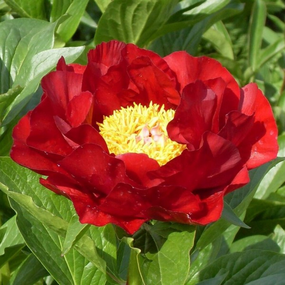 Мощный сорт с полумахровыми цветами, сияющими на солнце огненно-красными оттенками. Лепестки с волнистым краем. Ароматный. Среднего срока цветения.