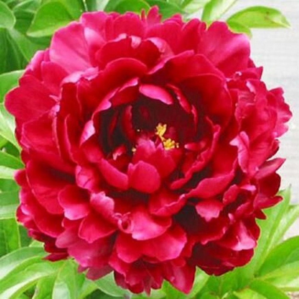 Пурпурно-красный цветок с тонкими гладкими лепестками. Кустарник имеет крепкий, довольно длинный стебель. На растении много цветов. Цветет в середине сезона. Корень пиона привит на травянистый.