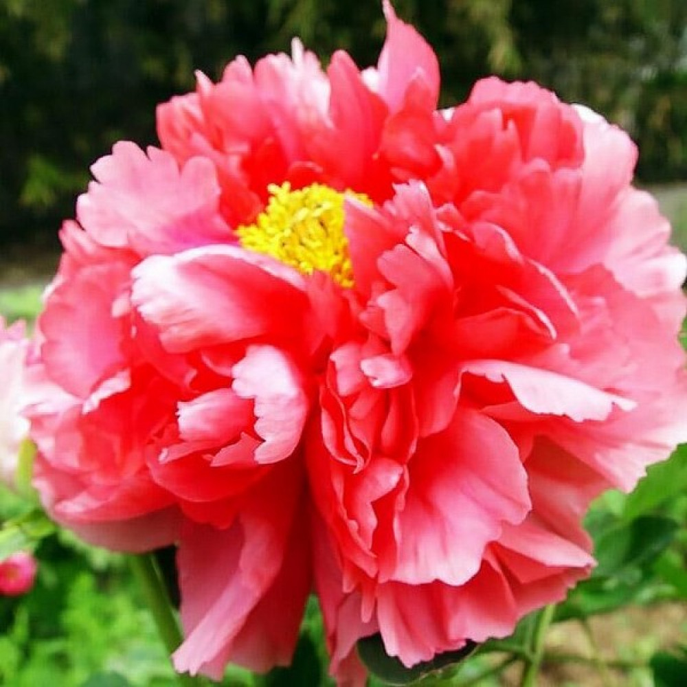 Кусты раскидистые, листва пышная. Цветки очень красивые, крупные. Соцветия похожи на большие хризантемы по типу цветения. Лепестки необычного малинового оттенка с белыми вкраплениями. Цветение обильное. Корень пиона привит на травянистый.