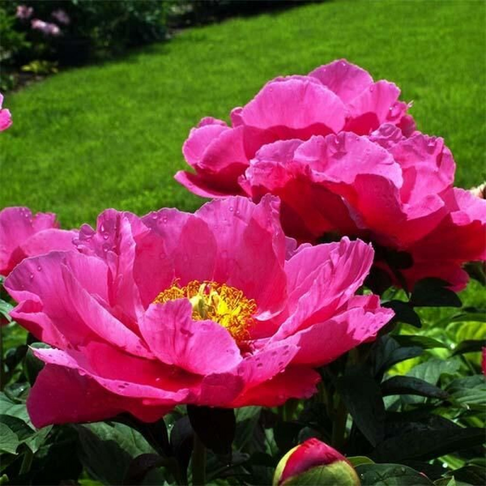 Крупные соцветия состоят из пяти рядов лепестков с восковой текстурой. Гофрированные, широкие лепестки имеют яркую, насыщенно-розовую окраску с алым оттенком у их основания. Эта ошеломляющая расцветка сразу бросается в глаза. Компактный куст отличается превосходной формой. Стебли прочные, с блестящими зелеными листьями. Этот пион относится к сортам раннего срока цветения. Яркий пион Paula Fay (Паула Фэй) завоюет ваше сердце!