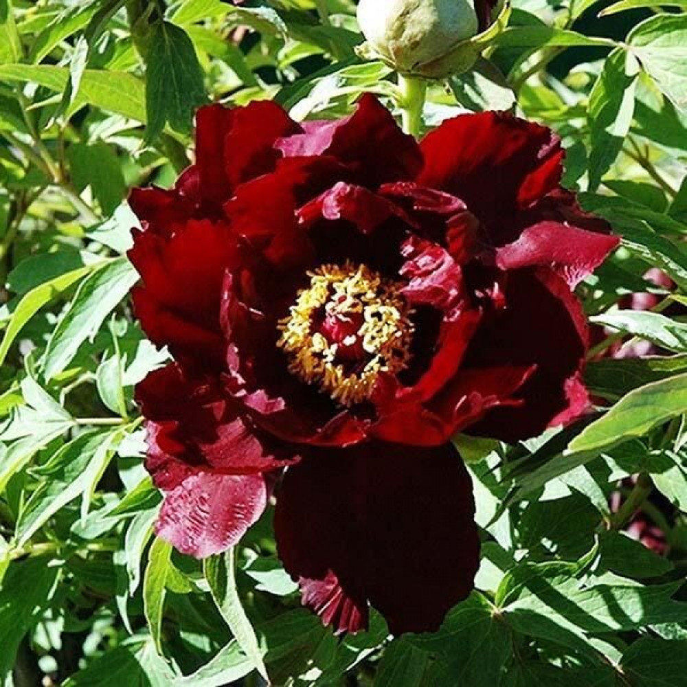 Быстрорастущий сорт. Лепестки темно-красные, почти черные. В центре пучок золотистых тычинок. Листья крупные, красивые. Корень пиона привит на травянистый.
