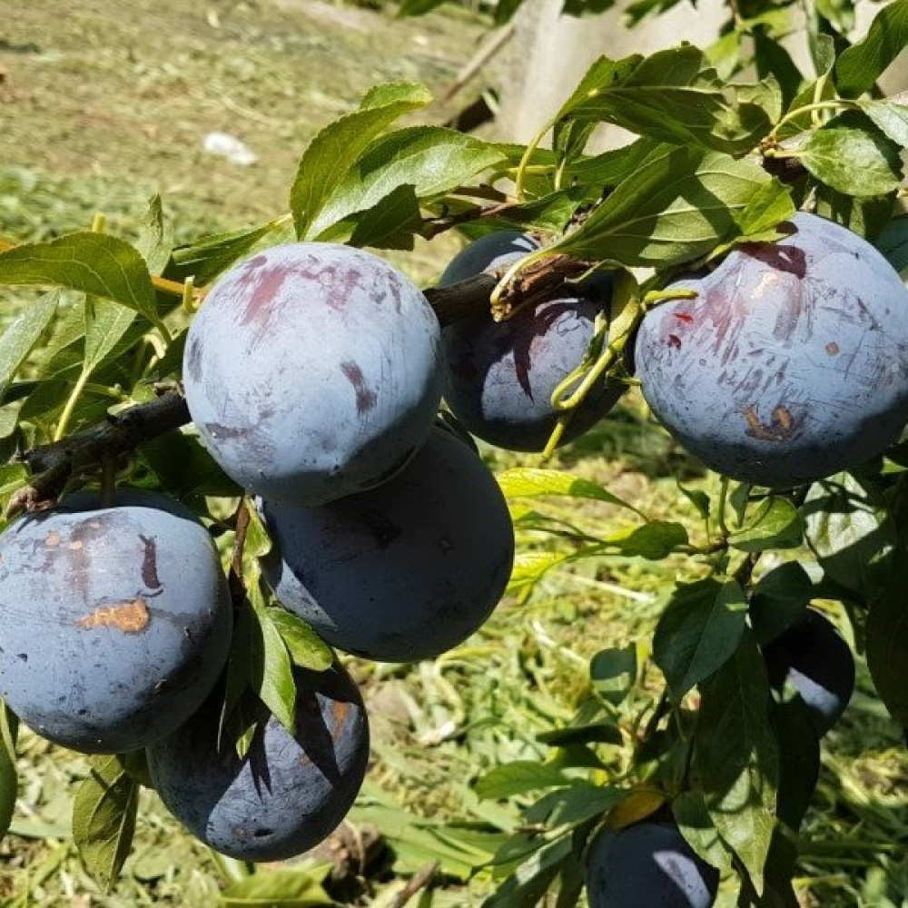 Слива Гигант предсталяет собой гибрид алычи и сливы. Отличительной чертой сорта является крупный размер плодов. Диаметр сливы может достигать 6 см, а вес 250 г. Форма плода немного вытянутая или округлая. Цвет сливы может быть фиолетовым, бордовым или желто-красным. Восковой налет небольшой, снимается достаточно легко. Кожица средней толщины, практически не влияет на вкусовые качества мякоти. Слива сладкая, с приятным ароматом.