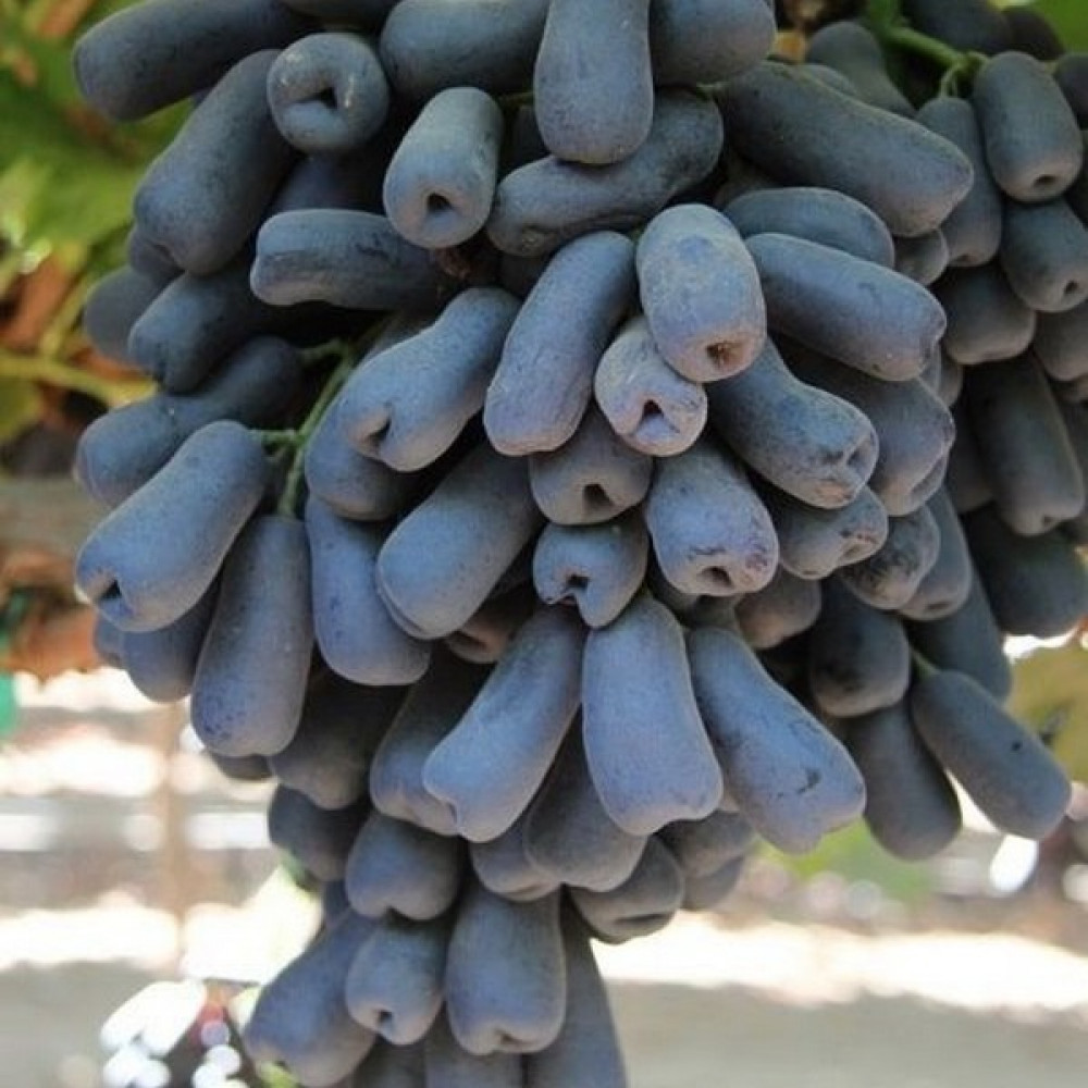 Кустарники винограда Капли луны средней силы роста. Цветки растения обоеполые, грозди достигают веса в 800 г, форма цилиндрическая. Срок созревания ягод средний, окрашены они в темно-фиолетовый оттенок, при полном созревании становятся практически черными. Виноградины сочные, аппетитные, сладкого вкуса. Урожай прекрасно хранится долгий срок и транспортируется на длительные расстояния.