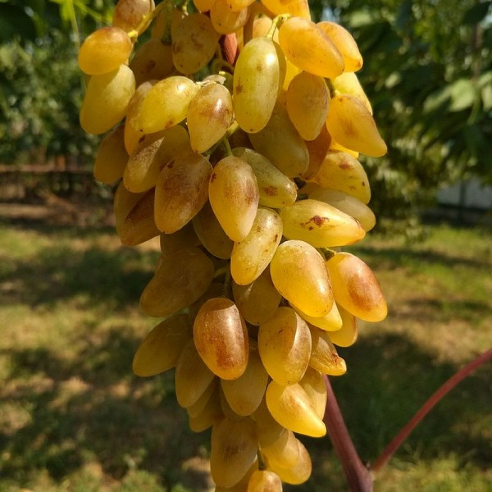 Среднеспелый сорт столового винограда, съемная зрелость которого приходится на начало осени. Крупные грозди достигают веса в 0,6-1 кг. Они сформированы ягодами светлого желто-зеленого оттенка, мясистыми и упругими. Приятный, типично виноградный вкус плодов делает их универсальными.