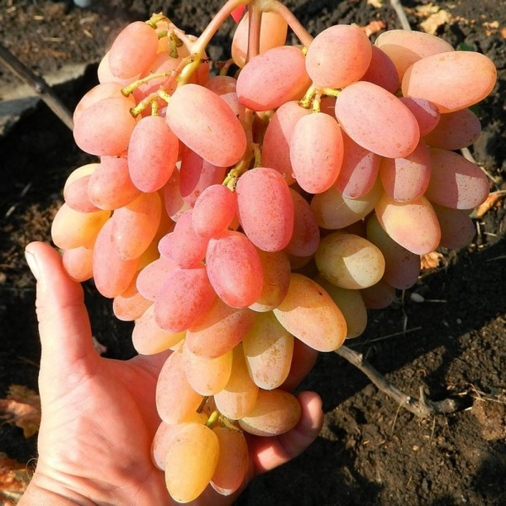 Столь громкое название сорта вполне объясняется его выдающимися характеристиками. Это сильнорослое растение с крупными желто-розовыми плодами высокотоварного вида. Средний вес грозди – 0,7-1,5 кг, продуктивность очень хорошая. Мясистые сочные ягоды с плотной кожицей, не трескаются от дождя, обладают приятным сладковатым вкусом.