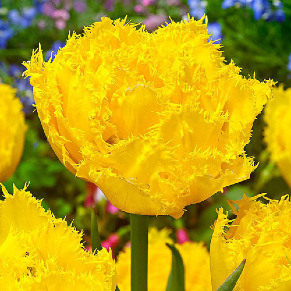 Этот сорт тюльпана настоящая экзотика. Махровые лепестки ярко-канареечного цвета украшены мелкой бахромой, которая проходит по краю. Очень нежно и эффектно. Бокал цветка отличается крупными размерами, крепкий стебель способен удержать яркое великолепие во время цветения.